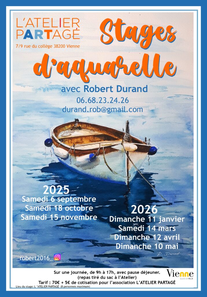 Le stage se déroule à l’Atelier Partagé, sur une journée, de 9h à 17h. Une coupure pour prendre un déjeuner « tiré du sac ». A chaque stage un thème différent sera proposé. Des stages de découverte dans un premier temps, pour connaitre les différents papiers et leurs caractéristiques, les couleurs ainsi que le matériel. Des exercices pour maitriser le cycle de l’eau. Réalisation d’une aquarelle personnalisée. Et par la suite des thèmes plus techniques, adaptés à des modèles différents: paysages, natures mortes ou improvisations.